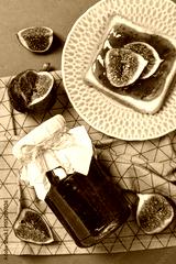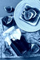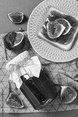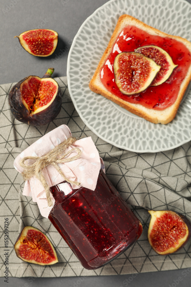Figs, jars of jam, towel and bread with jam on plate on gray background, top view