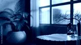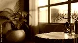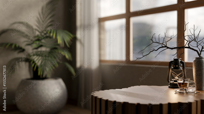 A glass of coffee and vintage oil lamp with dried branch in vase on wooden table in dim living room.