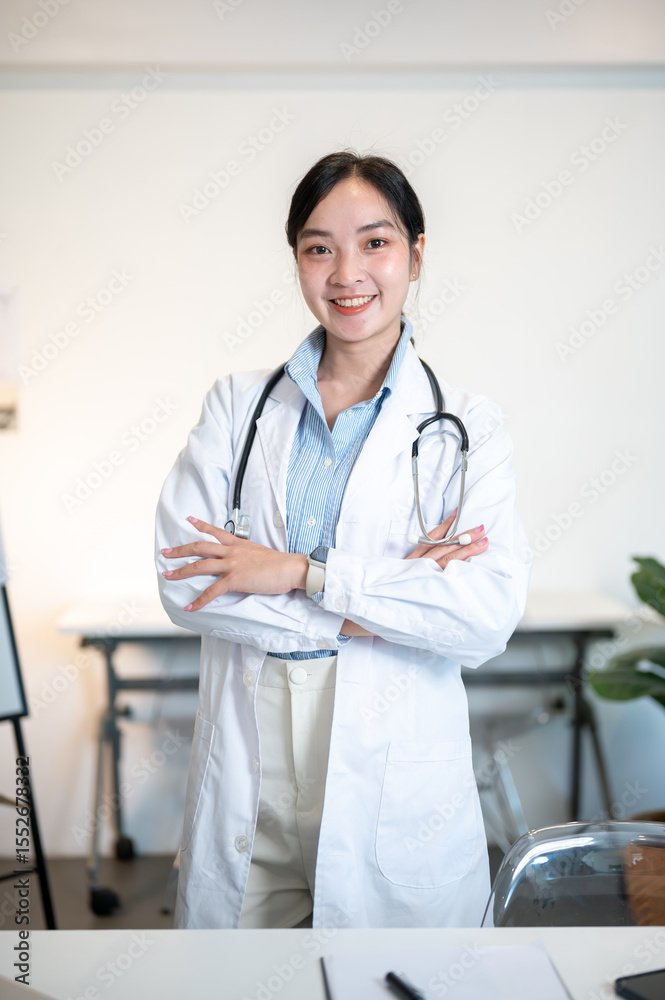 Asian female doctor with stethoscope smiling while standing with arms crossed in an examination room