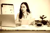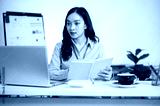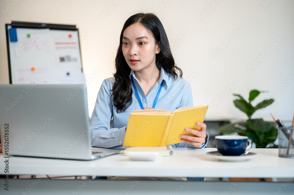 Female office worker or businesswoman holding yellow book and looking at laptop on working table.