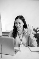 Female office worker or businesswoman raising or waving hand in greeting at laptop on working table