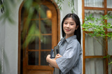 Smiling asian woman carrying her laptop with smartphone while standing in the cafe's outdoor garden.