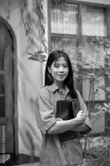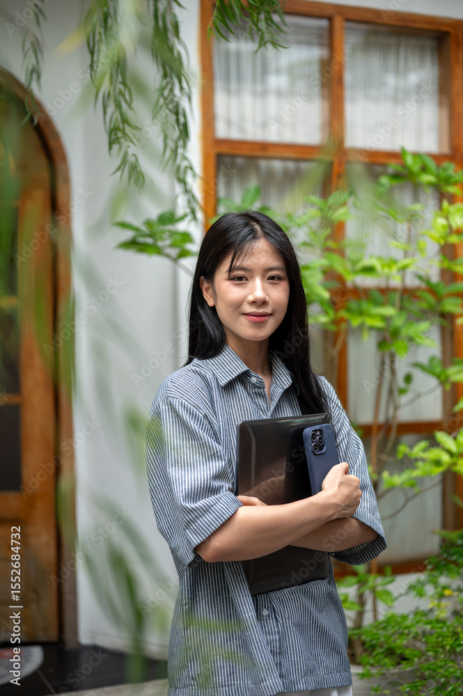 Smiling asian woman carrying her laptop and smartphone while standing in the cafe's outdoor garden.