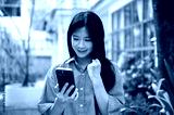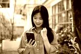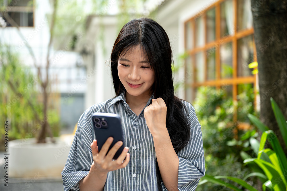 Smiling asian woman making a fist and looking at smartphone while standing in cafe's outdoor garden.