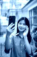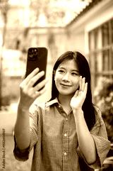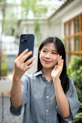 Close up of asian woman taking photo or selfie on smartphone while standing in cafe's outdoor garden