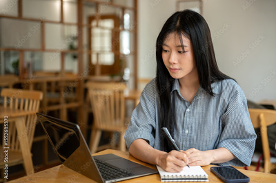 Asian woman writing in notebook with a pen while looking at laptop with phone on cafe's wooden table