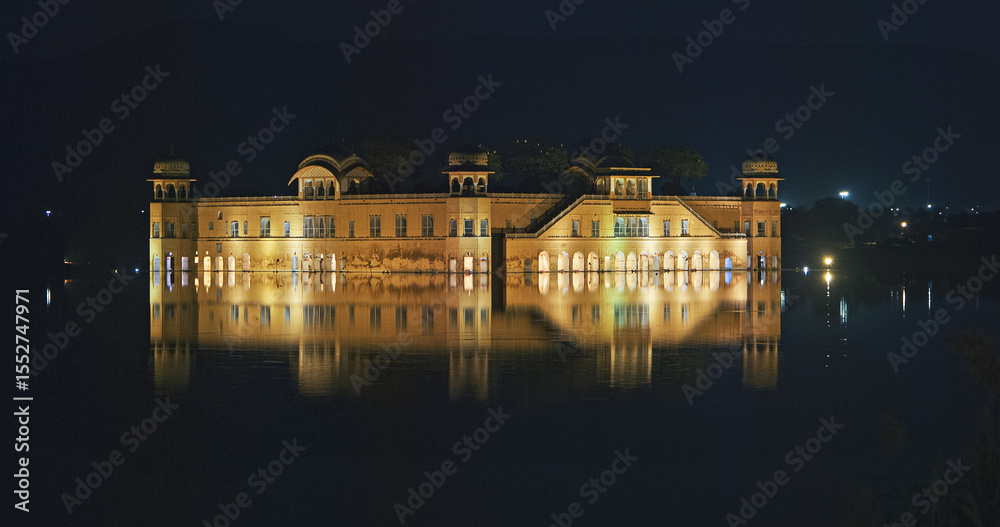 Jaipur, Rajasthan, India. Jal Mahal Or Water Palace In Night Illumination. Palace Inmiddle Of Man Sagar Lake. Was Originally Constructed Around 1699. Jal Mahal Palace Is Architectural Showcase Of