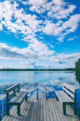 Wooden pier on blue lake with a bench and a ladder in Finland. The water is calm and the sky is blue