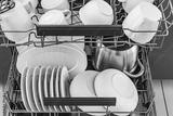 Dishwasher is full of white plates and bowls. The dishwasher is open and the plates are stacked in the racks