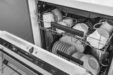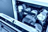Dishwasher is full of clean dishes. The dishwasher is white and silver