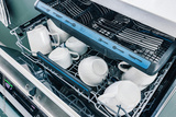 Dishwasher is full of white dishes and silverware. The dishwasher is on and the dishes are being washed