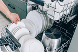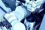Woman's hand is putting dishes into a dishwasher. The dishwasher is full of white plates and bowls