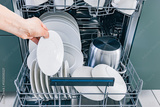 Person hand is putting dishes into a dishwasher. The dishwasher is full of white plates and bowls