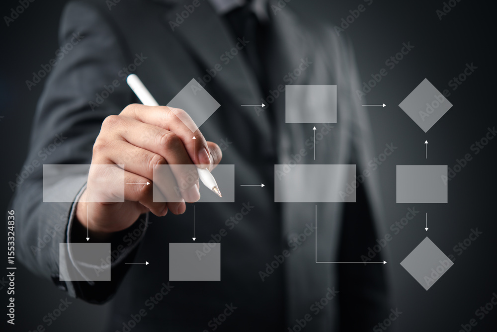 Businessman drawing a digital flowchart with a pen, illustrating the concept of process management and decision-making in the modern workplace.