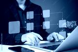 Business professional using a laptop to create a virtual flowchart, demonstrating digital technology for process organization and optimization.
