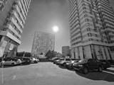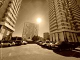 Parking lot with a row of cars and a building in the background housing estate condominium. The cars are parked in a row, with some of them being black and red