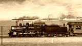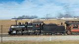 A vintage steam locomotive travels through a picturesque rural area, releasing smoke against a clear blue sky. Green fields and farm buildings adorn the landscape, creating a serene backdrop.