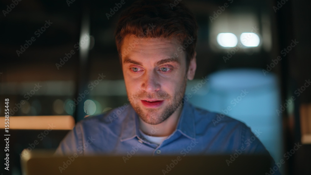 Smiling freelancer browsing computer feeling satisfied project at night closeup.