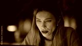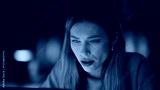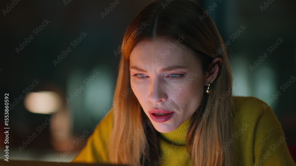 Portrait night worker looking laptop feeling stress. Overworked businesswoman