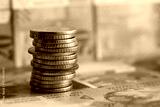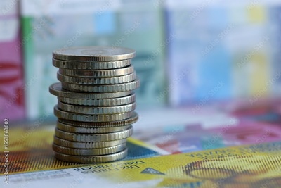 Swiss franc banknotes and coins. The current francs money bills and coins lies in big amount