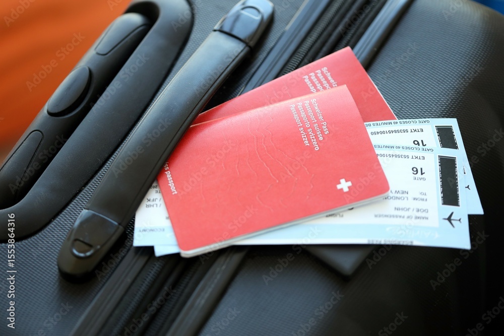 Swiss passport and avia tickets on travel bag. Pass and boarding tokens on bag close up