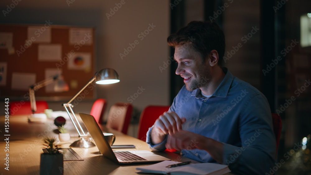 Enthusiastic man working night office closeup. Smiling businessman browsing