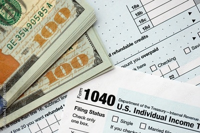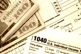 Hundred dollar bills and 1040 individual income tax return form blank close up