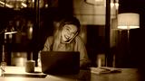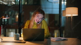 Smiling lady calling night office looking laptop screen closeup. Woman working
