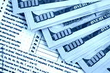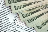 Big amount of United States USD dollar bills banknotes on table with 1040 tax return form