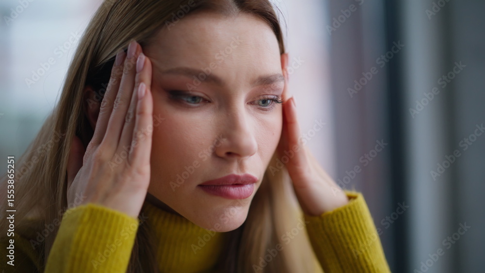 Frustrated woman suffering headache in modern office closeup. Stressed employee