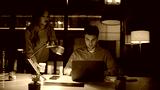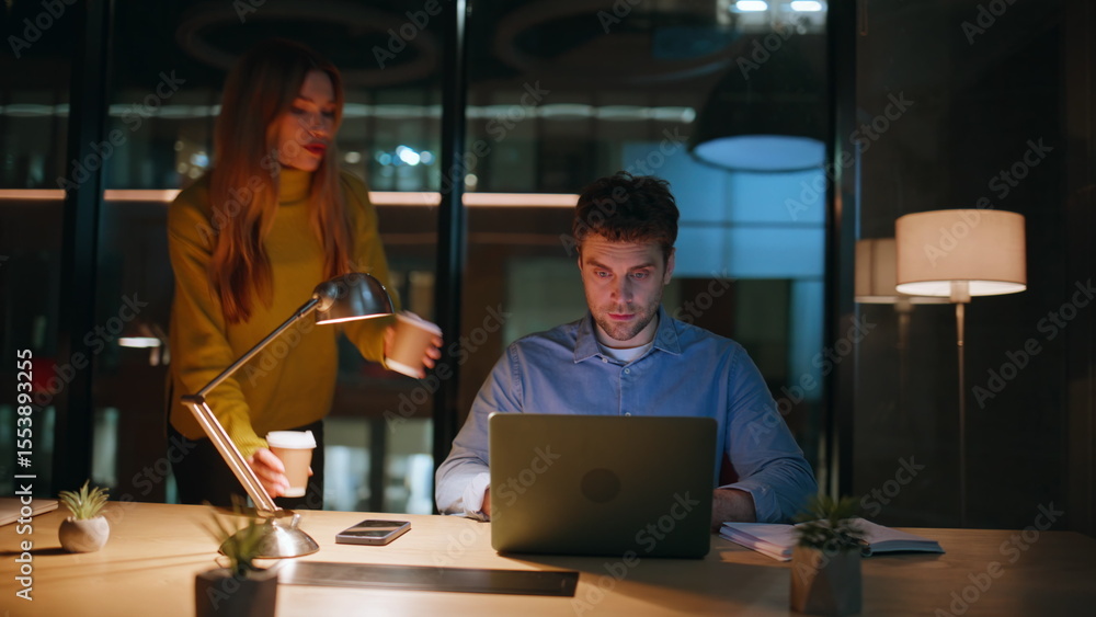 Woman colleague bringing coffee to man working laptop at night office closeup.