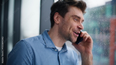 Smiling businessman finish call looking through window at city view closeup.