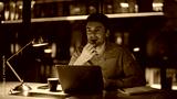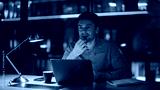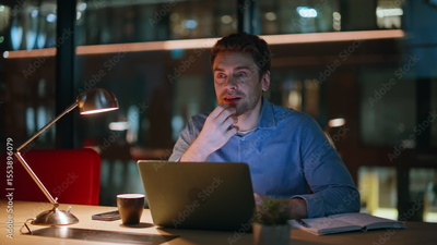 Entrepreneur planning project late evening in dark office closeup. Man working