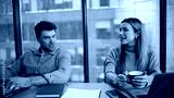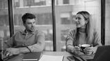 Friendly coworkers talking office closeup. Smiling woman man holding coffee cups