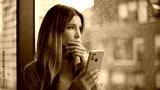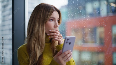 Thoughtful businesswoman holding mobile phone looking in window city closeup.
