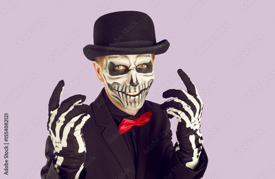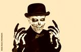 Portrait of young man with scary skull makeup. Spooky man wearing black bowler hat and red bow tie gesturing over isolated studio background. Day of the Dead, Halloween concept