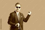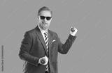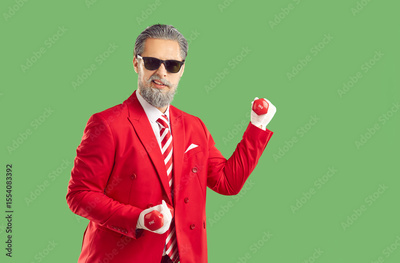 Merry Christmas. Funny, modern Santa Claus in stylish red suit and striped tie holds dumbbells, showing how strong he is.Portrait of happy, smiling, young, eccentric Santa on isolated green background