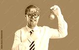Handsome man dressed in festive clothing, pretending being Santa Claus, pointing at Christmas tree decoration, isolated over green background. New Year is coming soon, think about decor