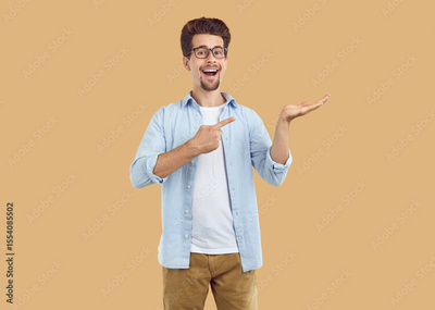 Laughing happy bearded man in glasses pointing index fingerand hand on copy space on beige background. Banner for advertisement, marketing, sales, offer, discount. Sincere human emotions concept.