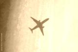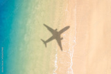 Aerial view of shadow passenger plane silhouette and sandy beach blue sea with waves at sea beach summer vacation sea travel concept