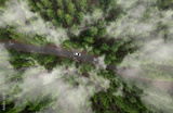 Aerial view of dark green forest road and white electric car Natural landscape and elevated roads Adventure travel and transportation and environmental protection concept