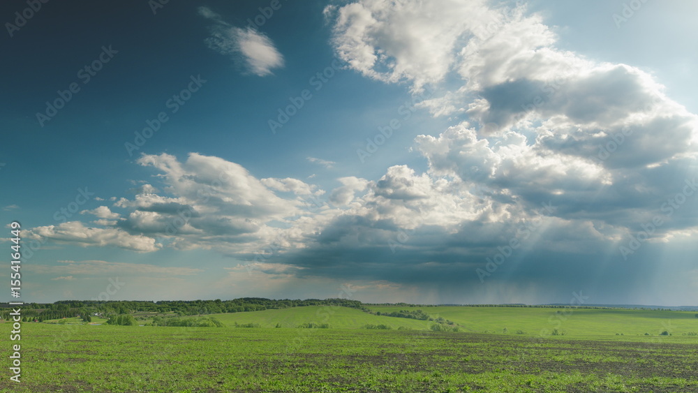 A tranquil green landscape stretches beneath a dramatic and cloudy sky that captivates the eye Time lapse.
