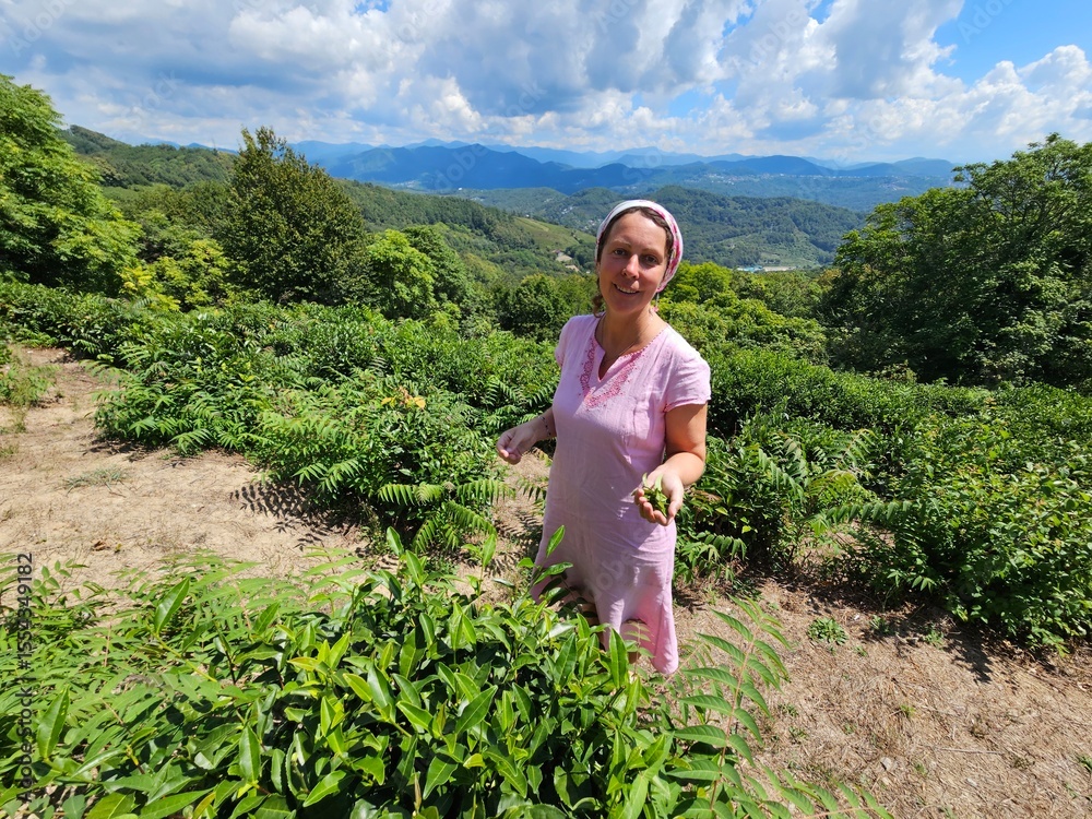 Woman is standing in a field of plants. She is wearing a pink dress. She is holding a green tea leaf in her hand
