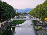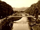 River with a bridge over it. The bridge is lit up at night. There are people walking on the bridge in Sochi