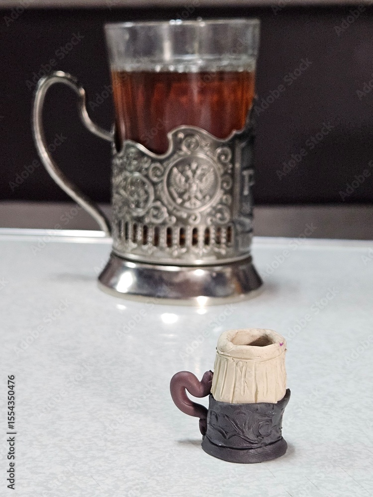Small cup plasticine with a handle sits on a table next to a large cup with tea. The small cup is miniature in train wagon
