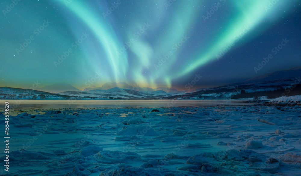 Breaking blue ice over frozen Norwegian Sea - Northern lights or Aurora borealis in the sky over Tromso, Norway