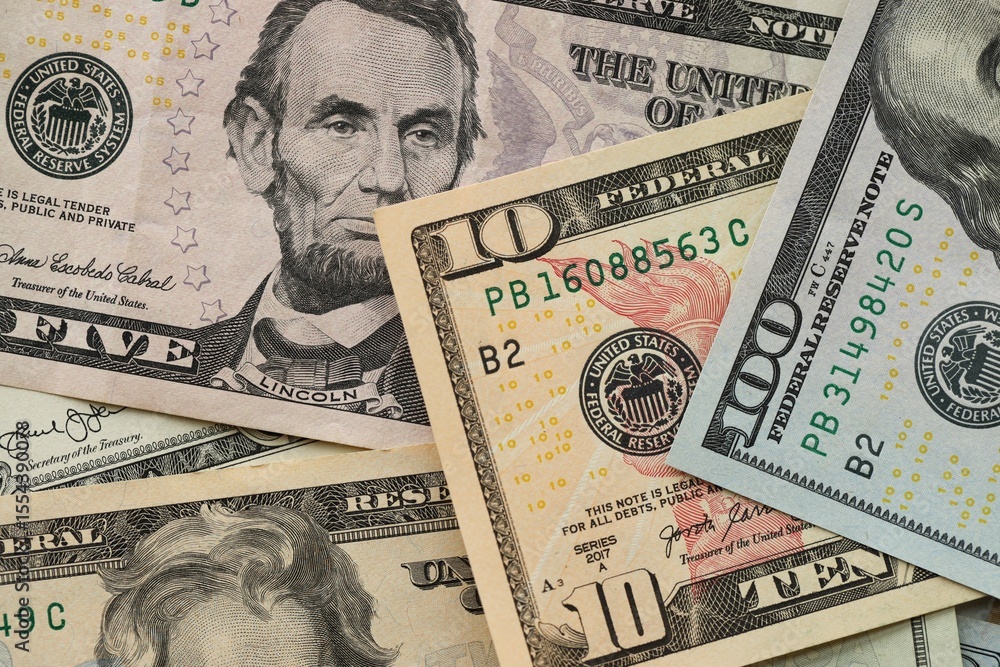Stack of dollar bills. Hundred, fifty, twenty, ten, five dollars banknote close up