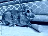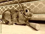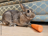 Rabbit dwarfish is laying on the floor with a carrot in its mouth. The rabbit is looking at the camera