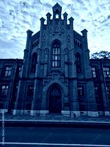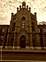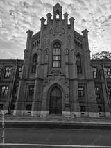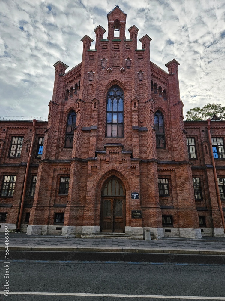 Brick building with a large archway. The building is red and has a clock on the front. Evangelical Women Hospital Ensemble in Saint-Petersburg