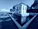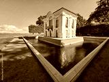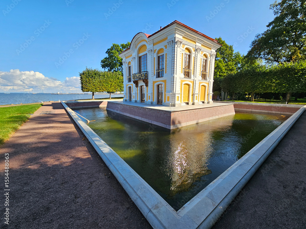 Building Hermitage Pavilion with a pool in front of it. The pool is surrounded by a brick wall. There are people walking around the area in Peterhof in Saint-Petersburg